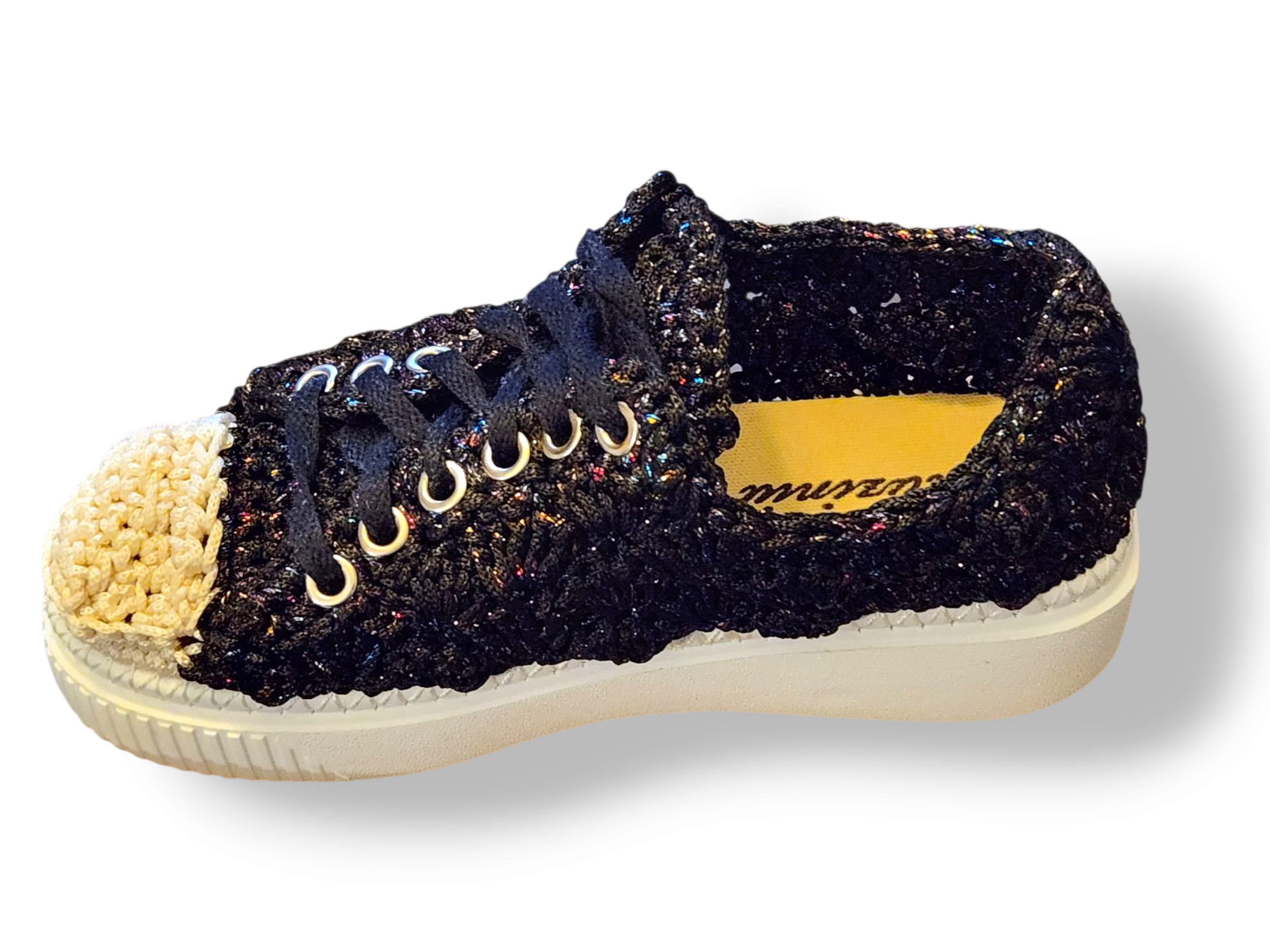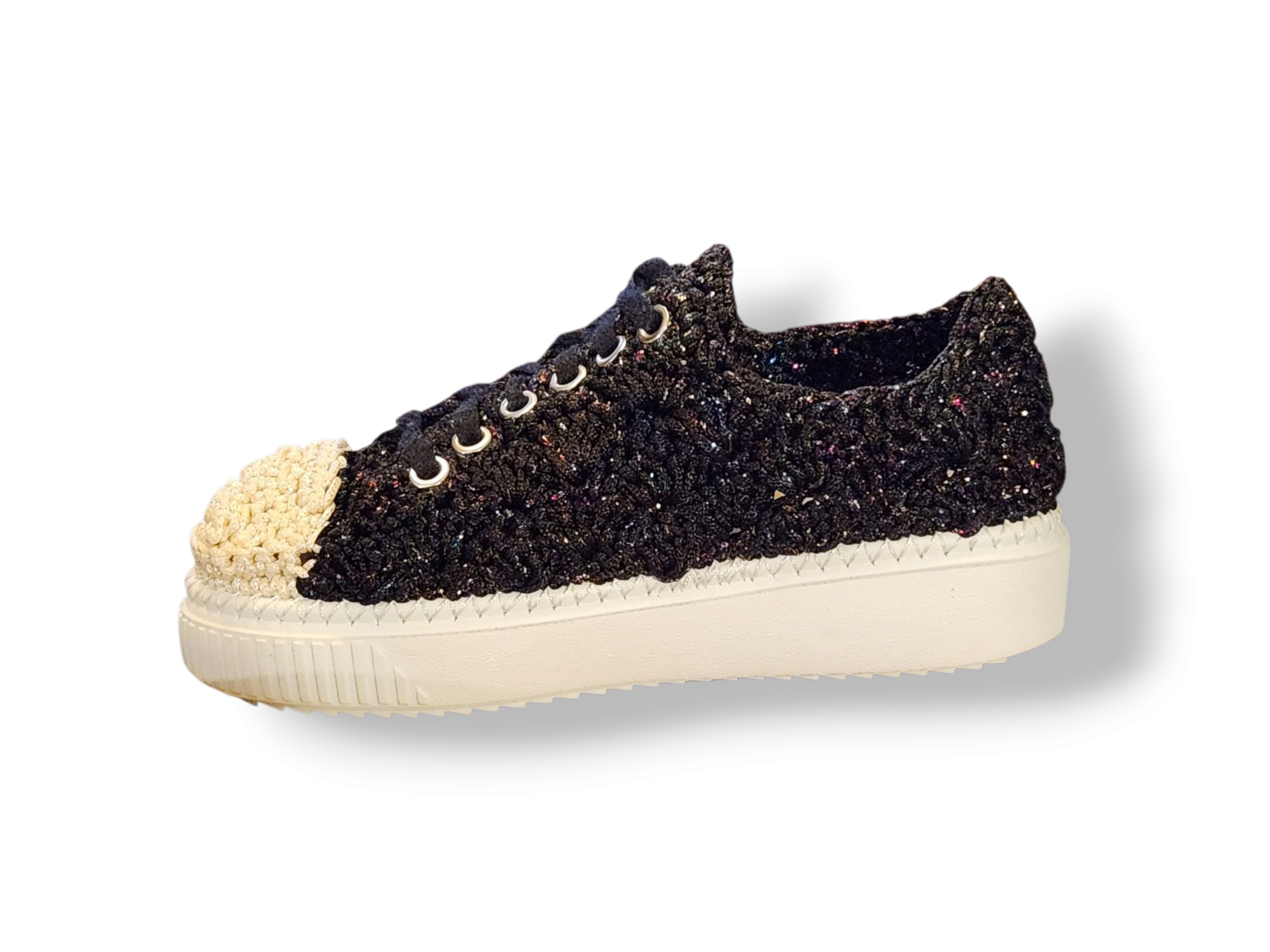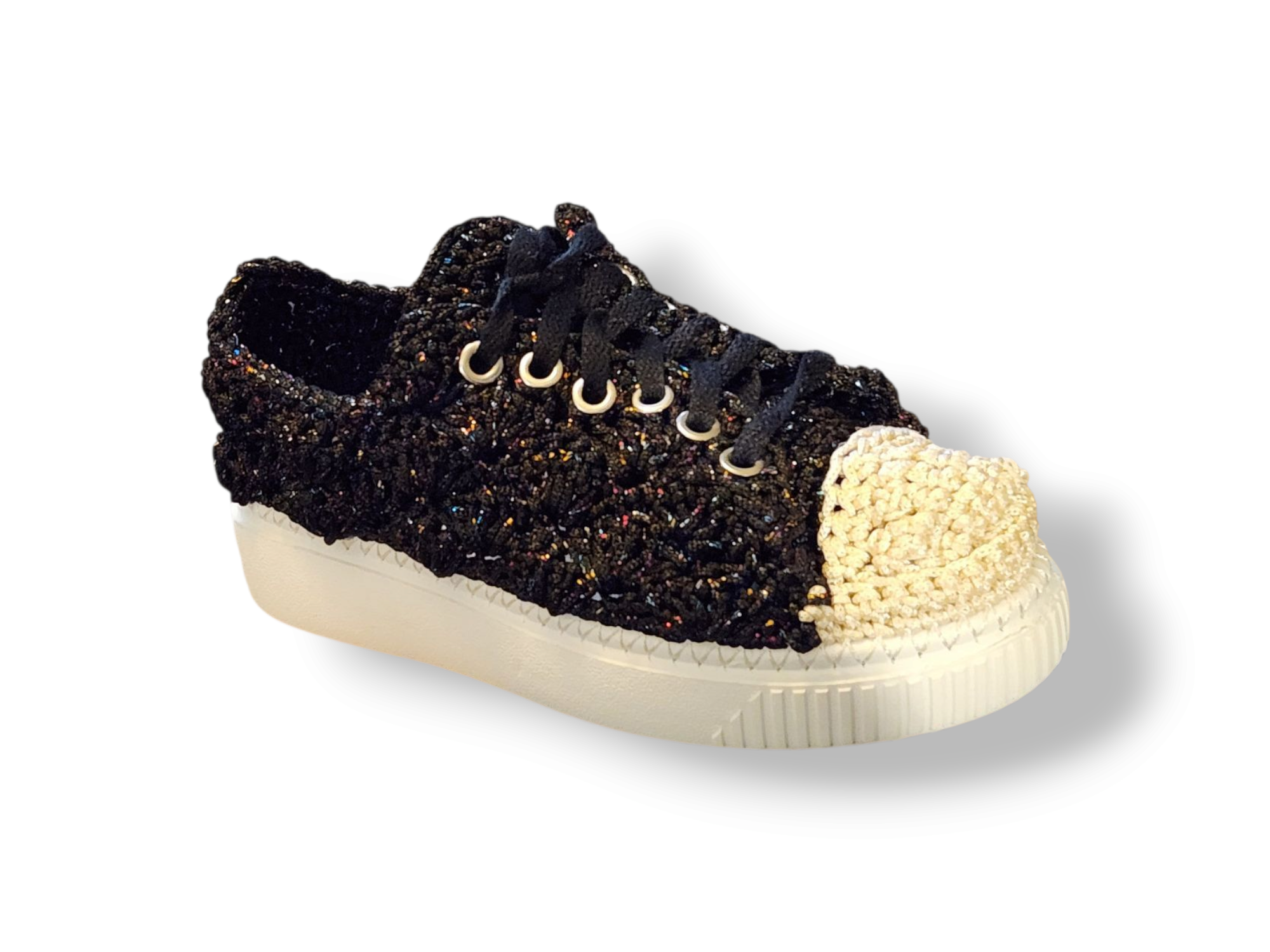 A celestial take on streetwear—hand-crocheted sneakers with a shimmer-black body, contrast toe, and silver hardware that’s ready to shine.