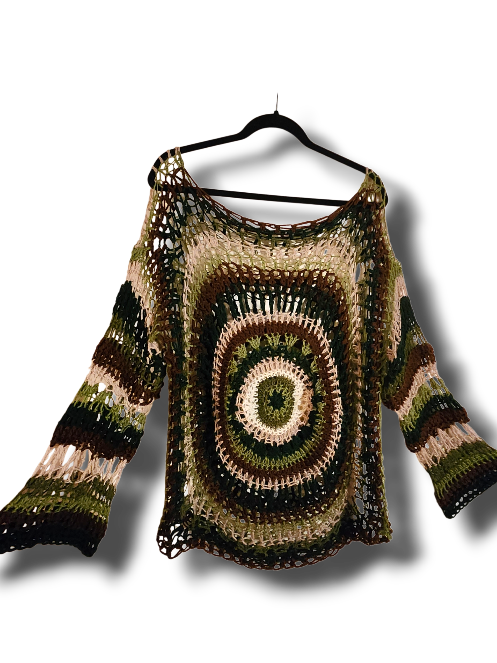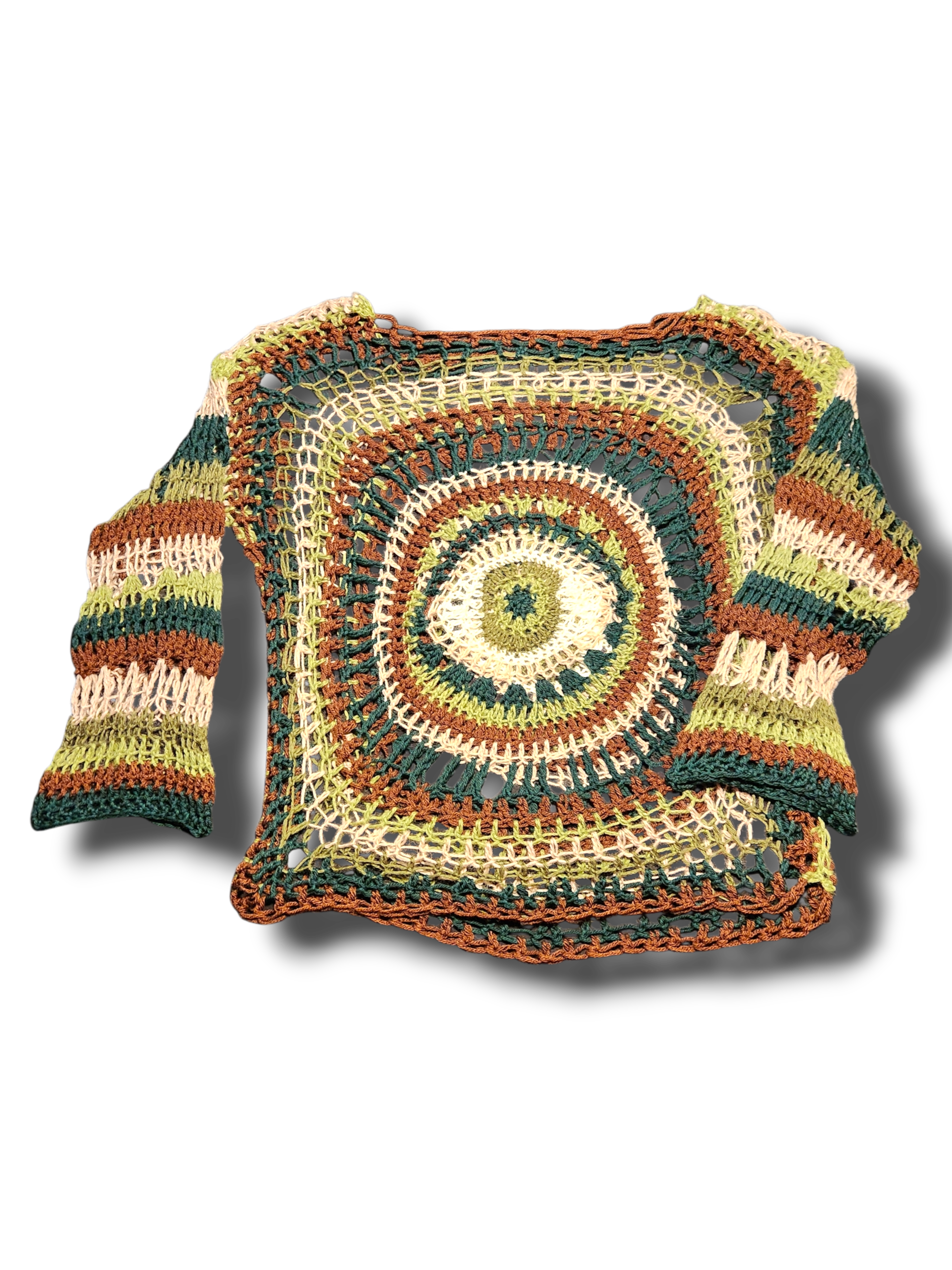 An airy, open-stitch design featuring concentric eye detail in natural, earthy tones. This sweater flows, drapes, and elevates—whether you're throwing it over a swimsuit or pairing it with your favorite chaos. Custom-made in your size and colorway, because this kind of magic doesn't come off a rack.