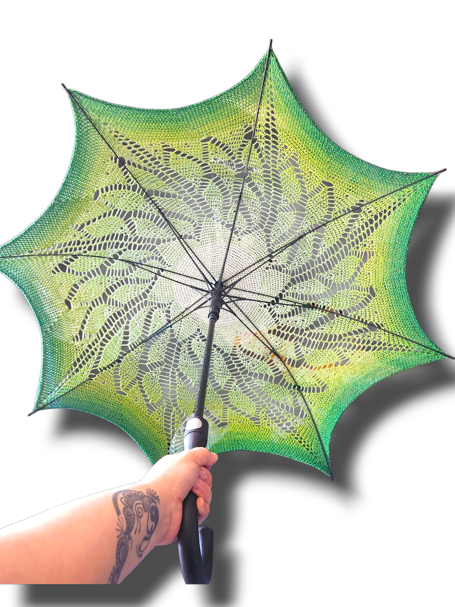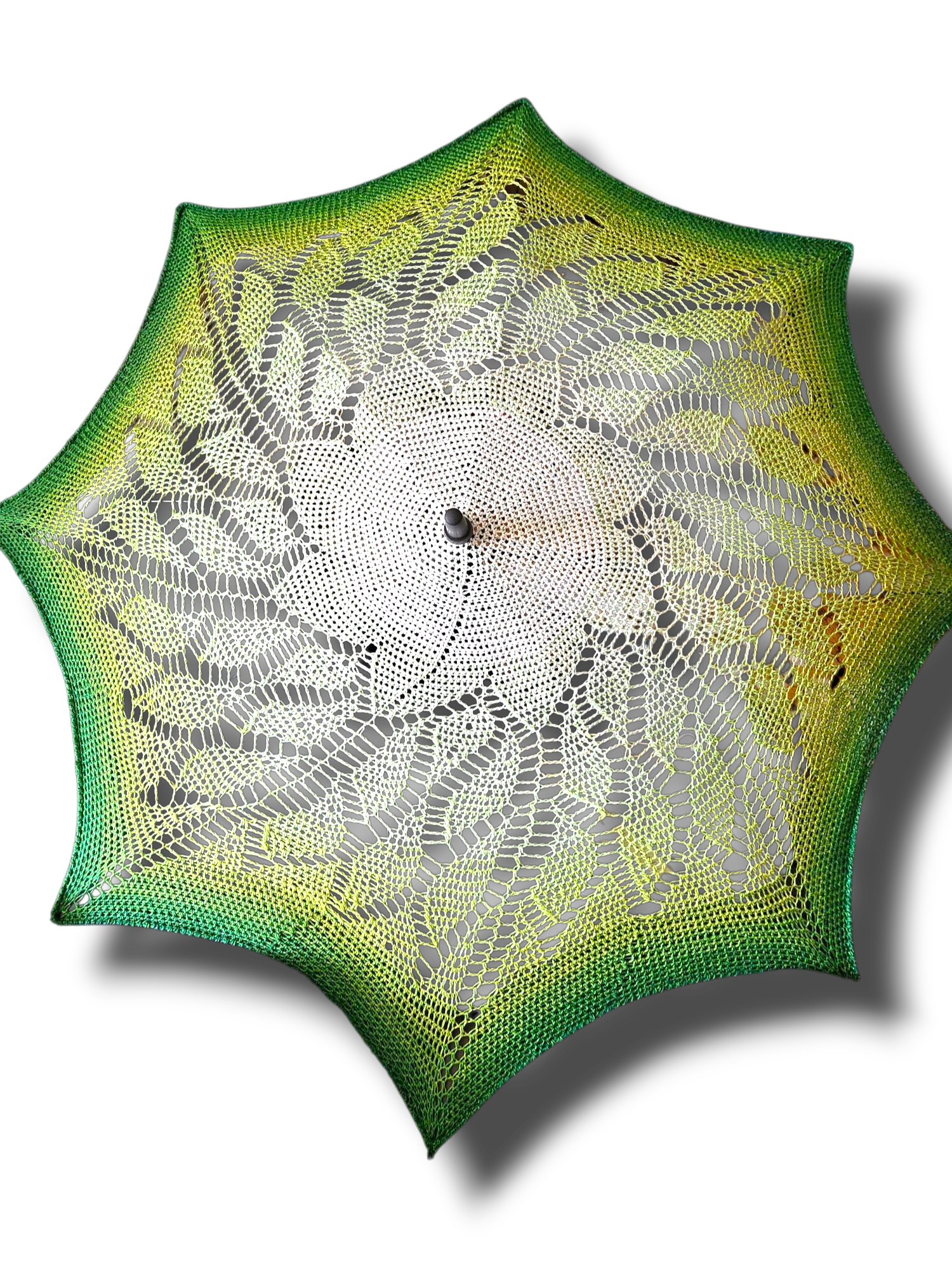 The Enchanted Canopy isn't just sun protection—it's a portal to another realm where dappled sunlight filters through mystical lacework and every shadow holds magic. This ethereal parasol features intricate dimensional crochet work that creates a mesmerizing web of protection, shifting from deep forest green at the edges to luminous center white like filtered moonbeams through ancient trees.