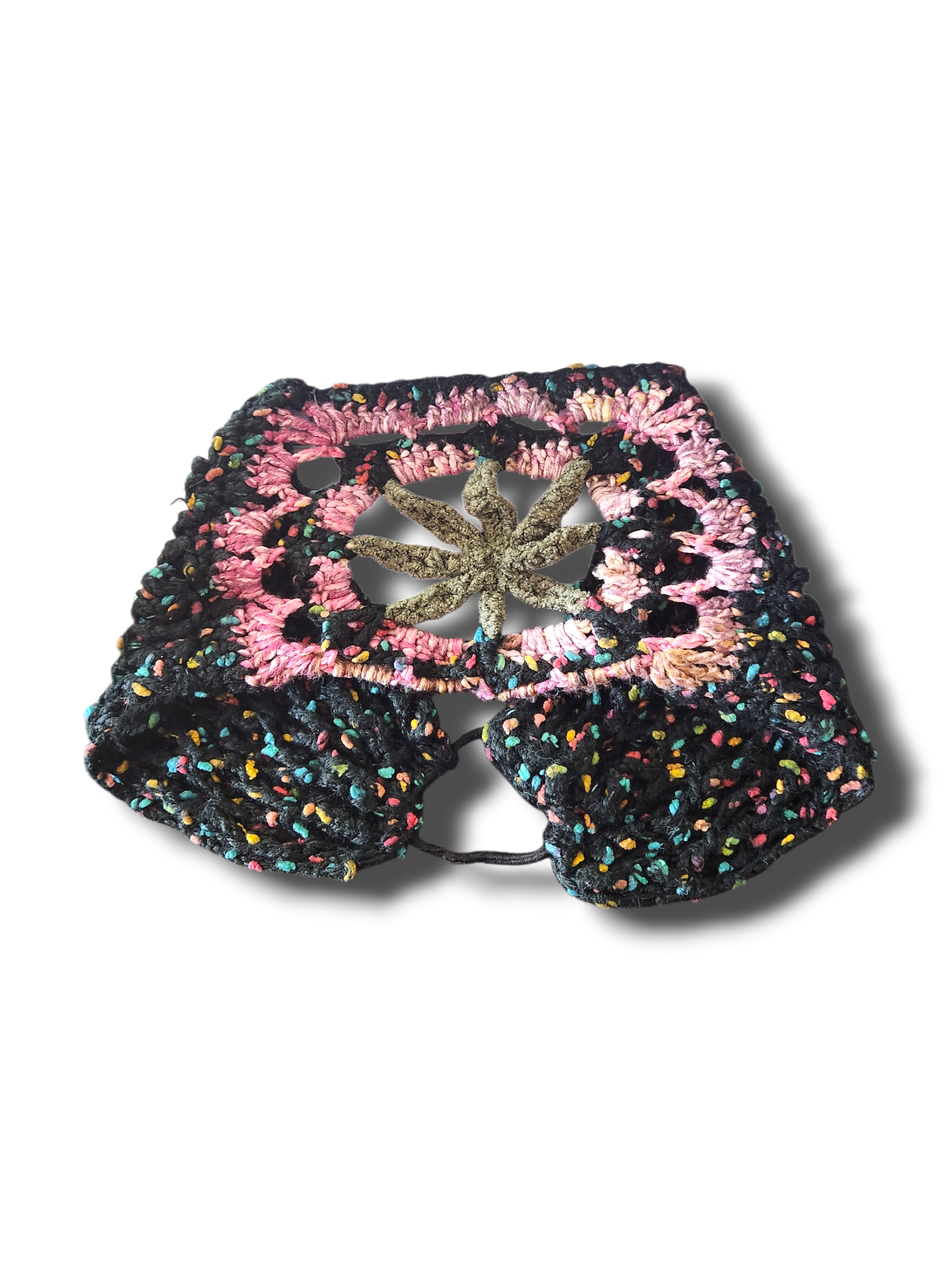 Black confetti yarn meets playful pink scallops and a gold cannabis leaf motif. This headband doesn't apologize for anything—it's bold, textured, and made for those who know good vibes come from good choices. Stretchy, comfortable, and unapologetically you.