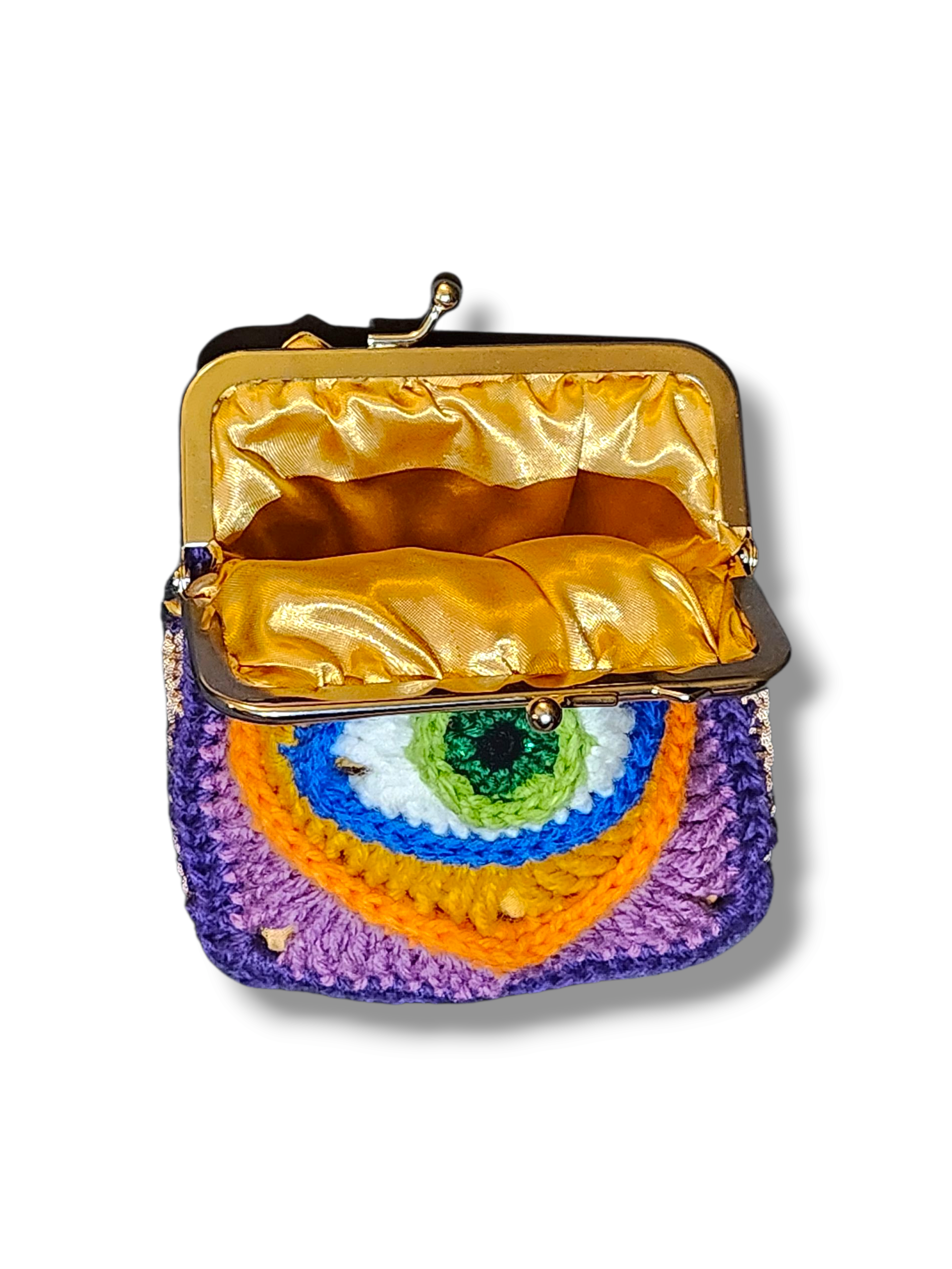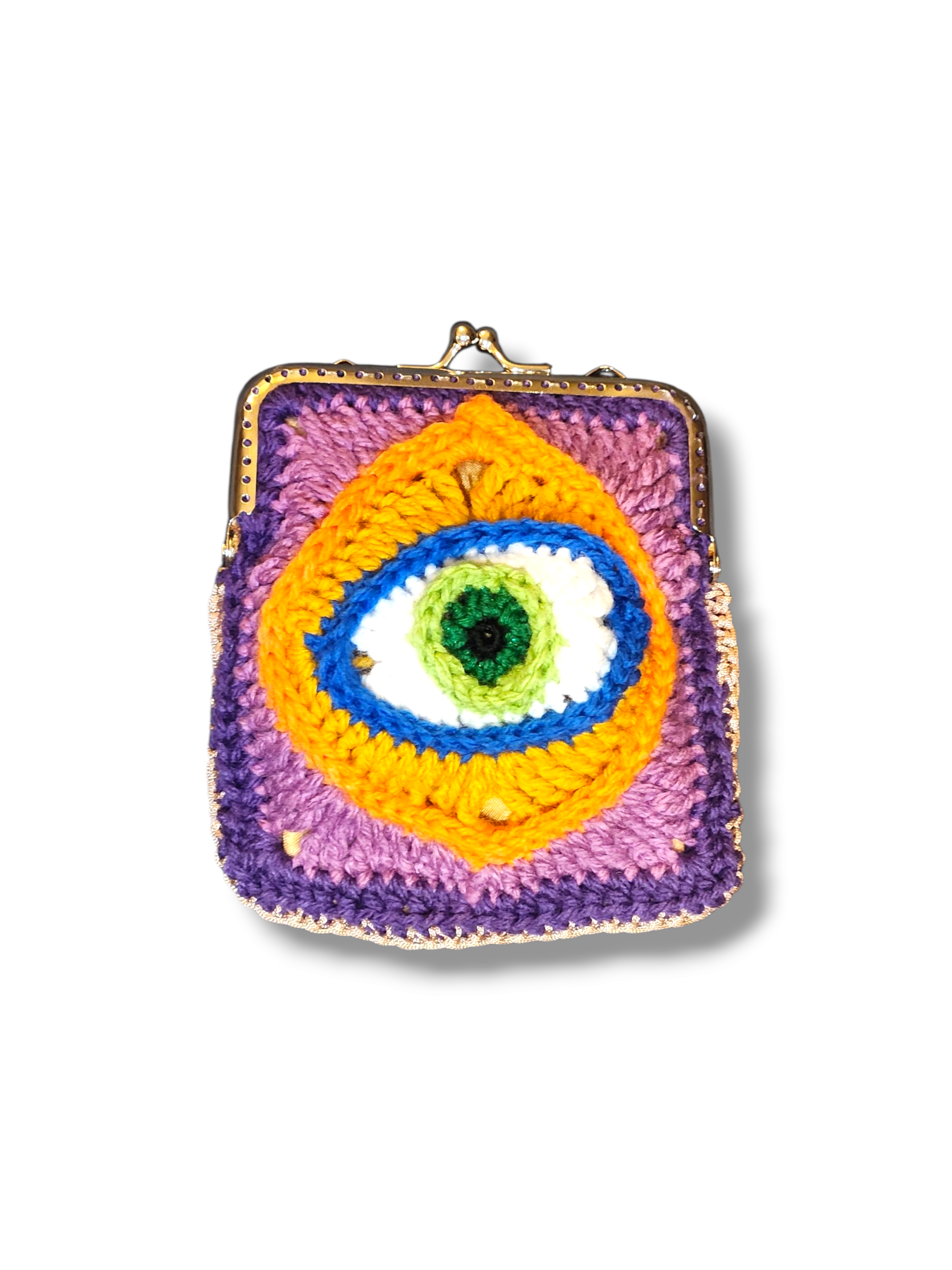 Meet your new mystical companion that sees all and judges nothing (well, maybe your coffee order). Hand-crocheted in vibrant purple, orange, blue, and green with an all-seeing eye that keeps watch over whatever chaos you carry.