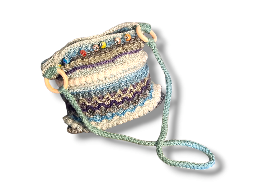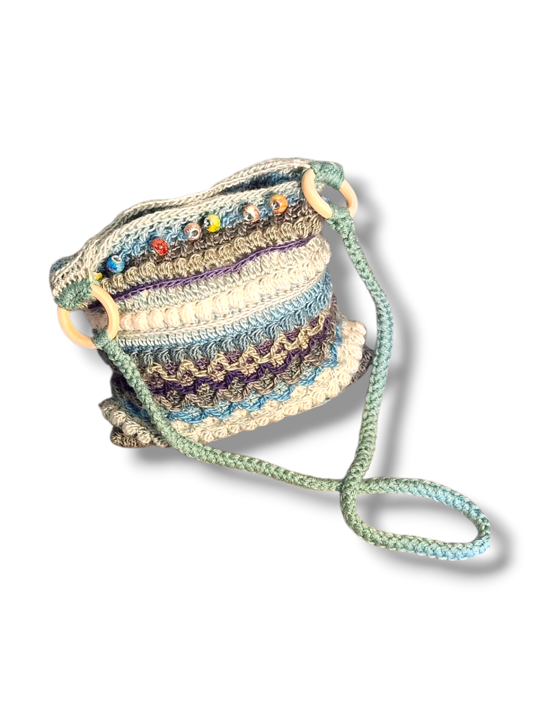 For those who follow the moon and chase the tide, the Tide Turner Bag is your wearable reminder to flow with the vibes. Hand-crocheted in sun-faded blues, ivories, and lilacs, it’s topped with a row of hand-strung beads for that tiny pop of playful sparkle.